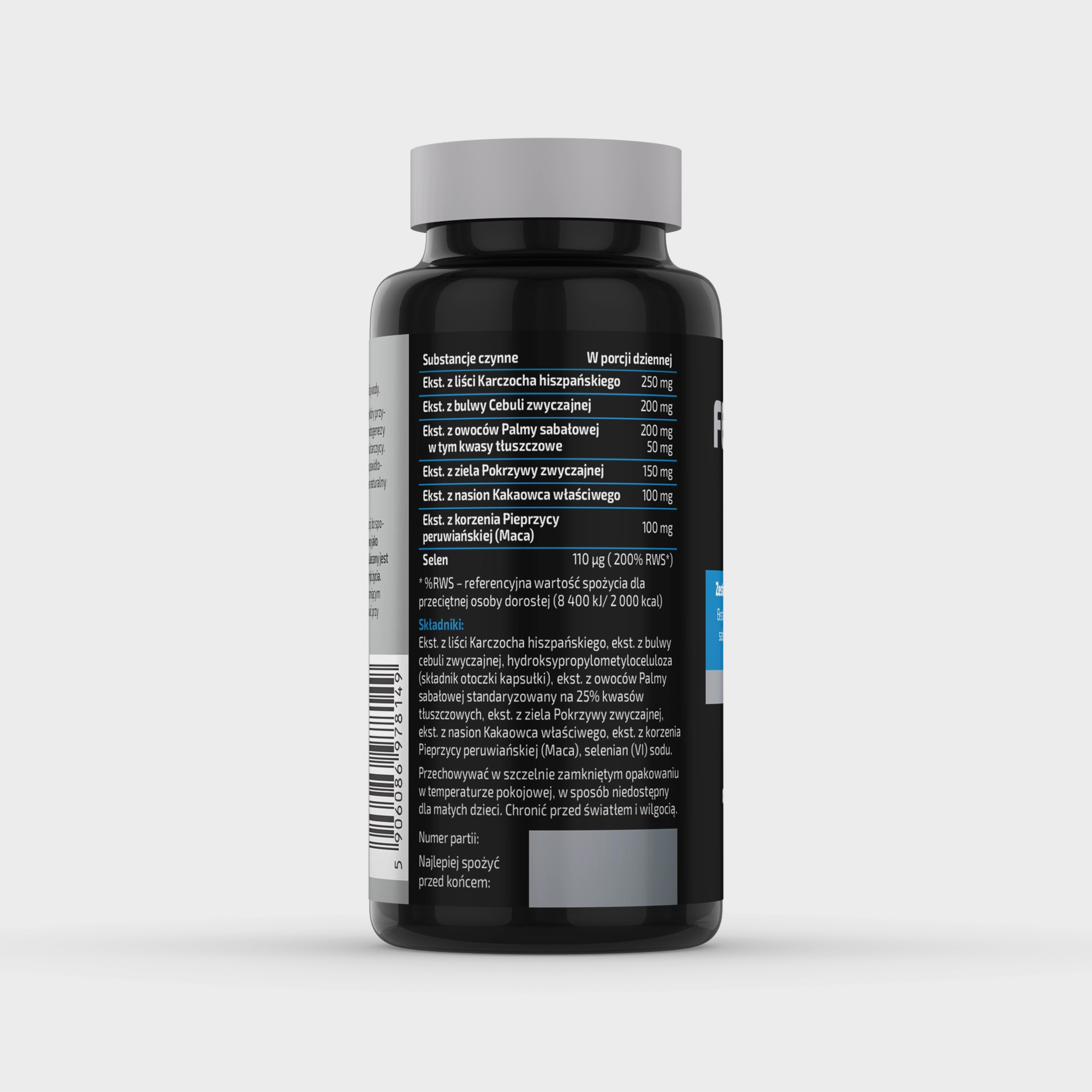 Aktywne składniki: Ekstrakt z karczocha hiszpańskiego, Cebula zwyczajna, Palma sabałowa, Pokrzywa zwyczajna, Kakaowiec właściwy, Pieprzyca peruwiańska ( Maca), Selen